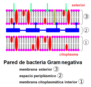 actúan como saco que rodea a toda la célula para proporcionarle así resistencia mecánica, protección de los fenómenos osmóticos y gran rigidez. Destaca la mureína como peptidoglucano. Dependiendo de la composición de la pared podemos distinguir las bacterias Gram + y Gram -, dependiendo de si se tintan de azul o rojo en presencia de colorante.